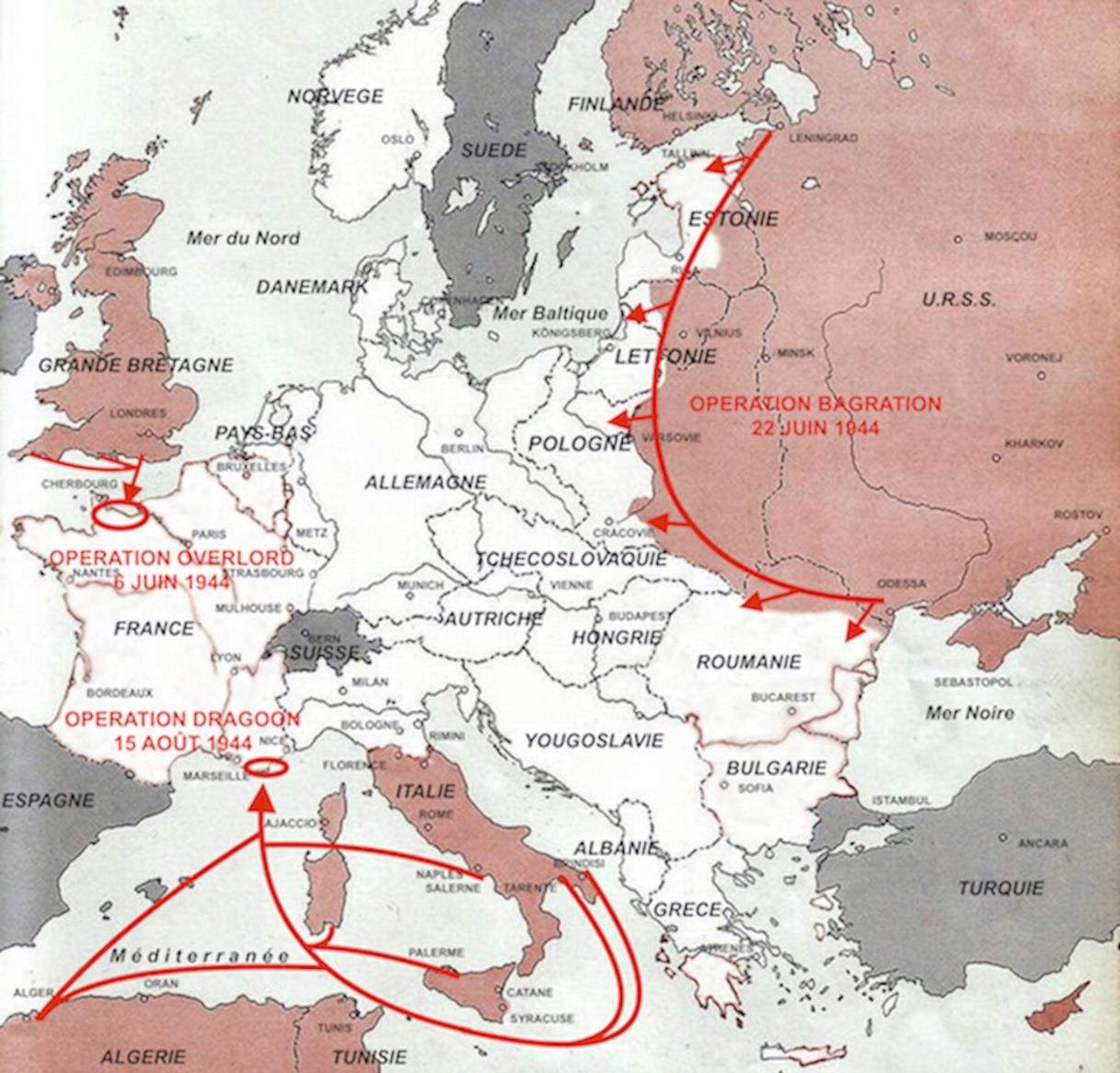 Le front qui s’est ouvert à l’Ouest et qui va mobiliser quantité d’unités de la Wehrmacht, va donner à l’Armée rouge l’occasion de lancer sur le front de l’Est le 22 juin, une vaste offensive générale l’opération « BAGRATION », dans les pays baltes, la Pologne et la Roumanie.