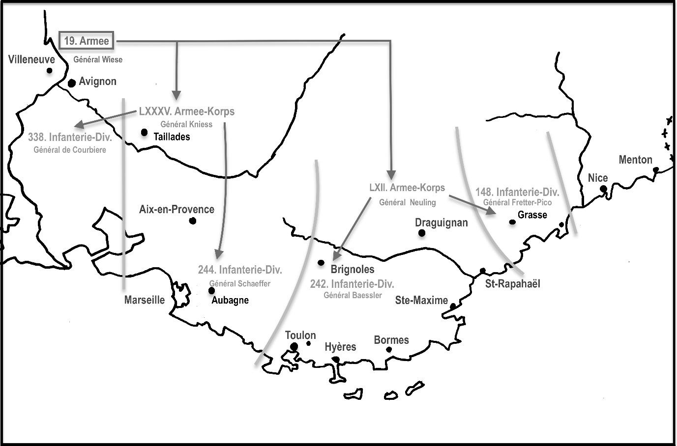Le général Wiese qui commande la 19e armée à l’Est du Rhône et dont le PC est à Villeneuve-lès-Avignon, sait parfaitement que le débarquement qui va avoir lieu se fera à l’Est de Toulon, mais il ne sait pas précisément où.