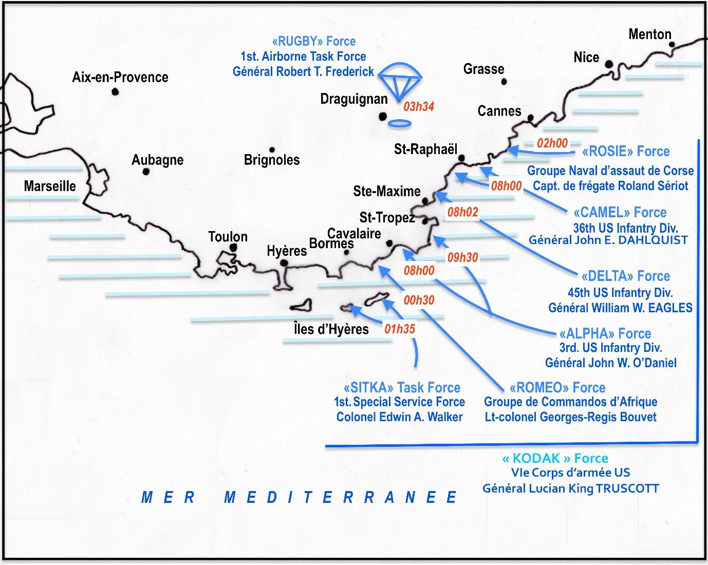 Les opérations sont confiées à la 7e Armée américaine du général Patch qui comprend deux corps d’armée, le 6e corps US « KODAK » Force du général Lucien King Truscott et la 1re Armée française du général de Lattre de Tassigny.