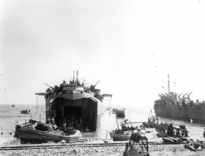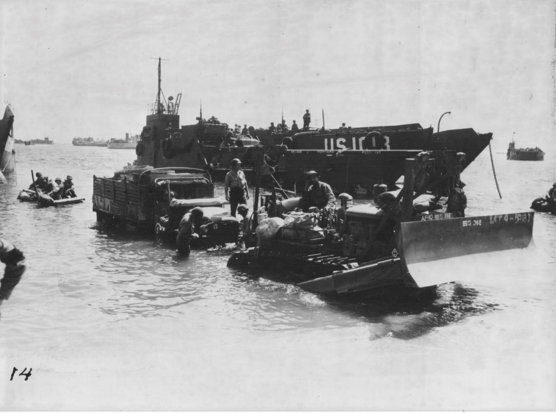 Les véhicules débarquent des LCT sur Red Beach, mais le sable fin et la profondeur de l’eau rendent l’opération délicate.