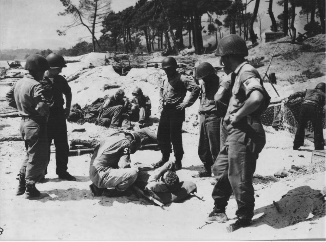 Des sapeurs du 36th Engineer Combat Regiment et des marins américains portent assistance à un blessé. La plupart des tués et des blessés américains sur la plage de Cavalaire le seront par des explosions de mines et autres pièges explosifs disposés par les troupes allemandes en prévision d’une opération amphibie.