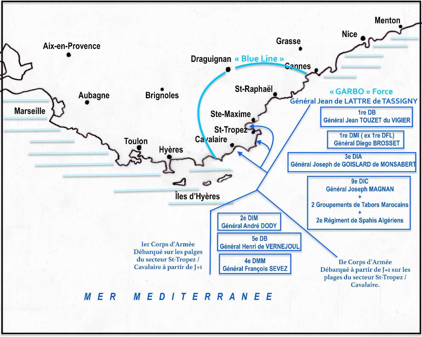 Les deux corps d’armée français qui constituent la « GARBO » Force débarquent à partir de J+1 sur les plages de Cavalaire, de Pampelonne ainsi que celles du Golfe de St-Tropez.