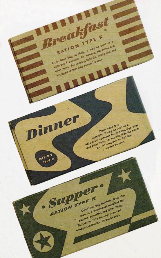 Rations K US, contenant des conserves alimentaires, des biscuits de combat faisant office de pain, des pâtes de fruit, du café en poudre, un paquet de quatre cigarettes, du sucre en morceaux, du chocolat, des chewing-gums, une clé pour ouvrir les conserves, ainsi que des pastilles désinfectantes pour l’eau (Halazone) et du papier hygiénique.