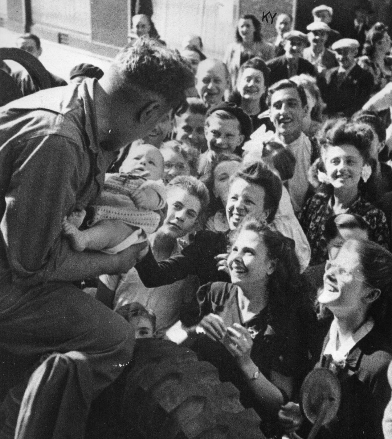 Liesse populaire et distribution de chewing-gums. Un soldat, juché sur son véhicule DODGE, a pris dans ses bras un bébé que sa mère vient du lui confier en témoignage de reconnaissance.