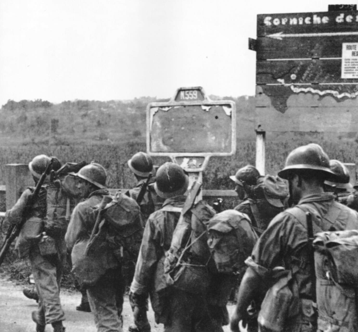 Le 16 août, ces tirailleurs algériens de la 3e DIA ont débarqué au fond du Golfe de St-Tropez et marchent à présent vers Toulon en suivant la Nationale 559 qui serpente entre la mer et le massif des Maures.